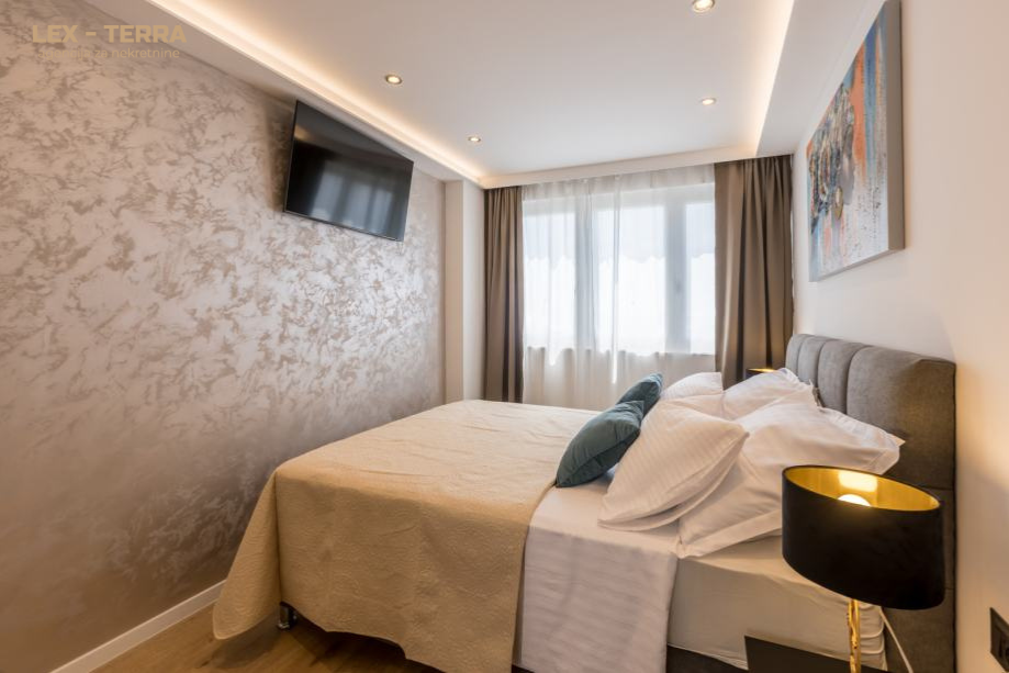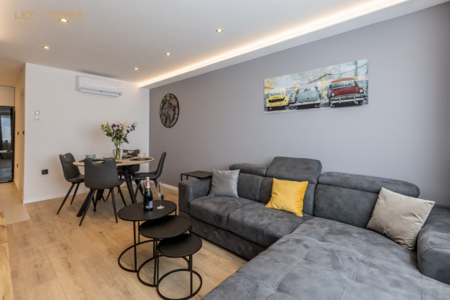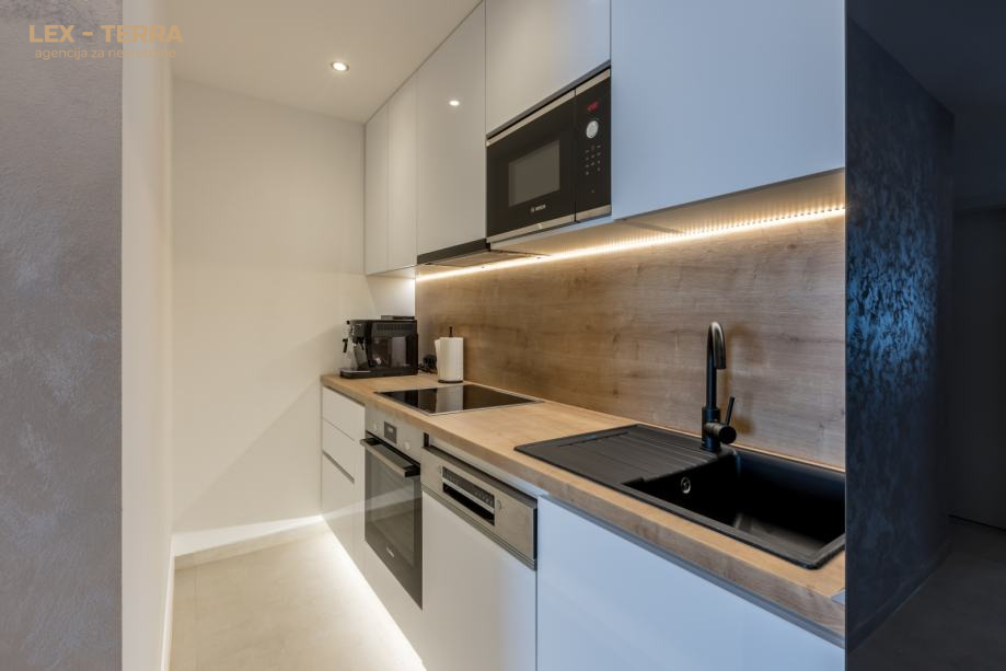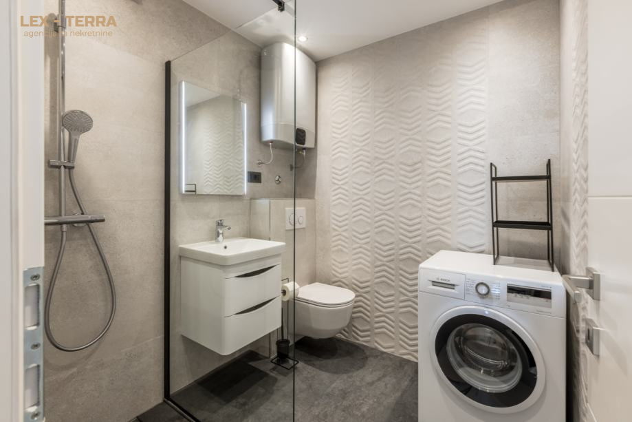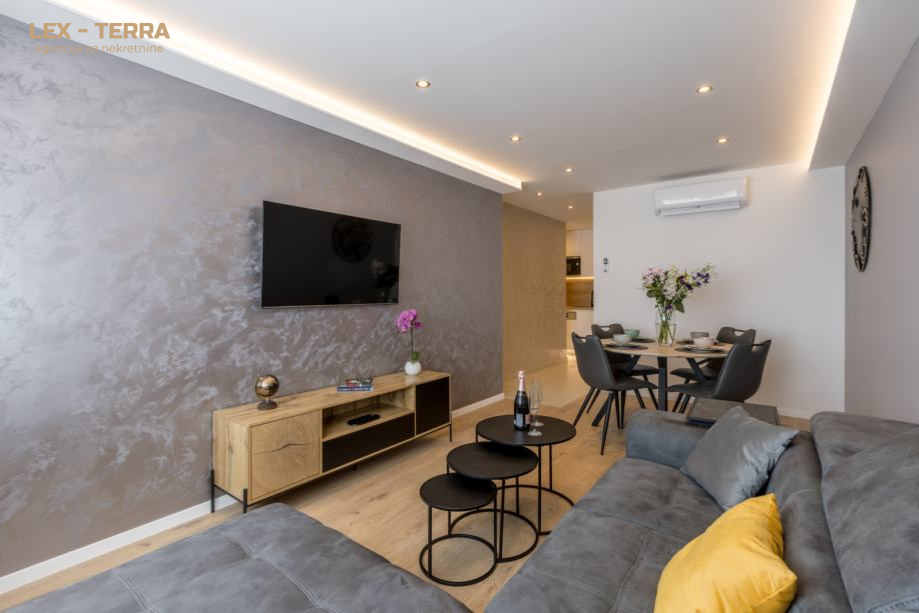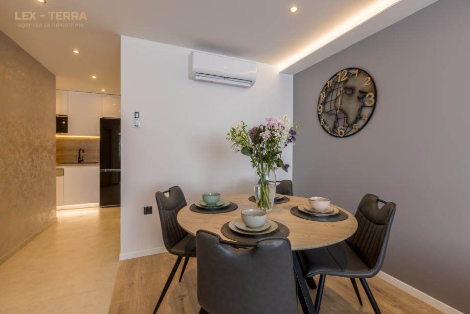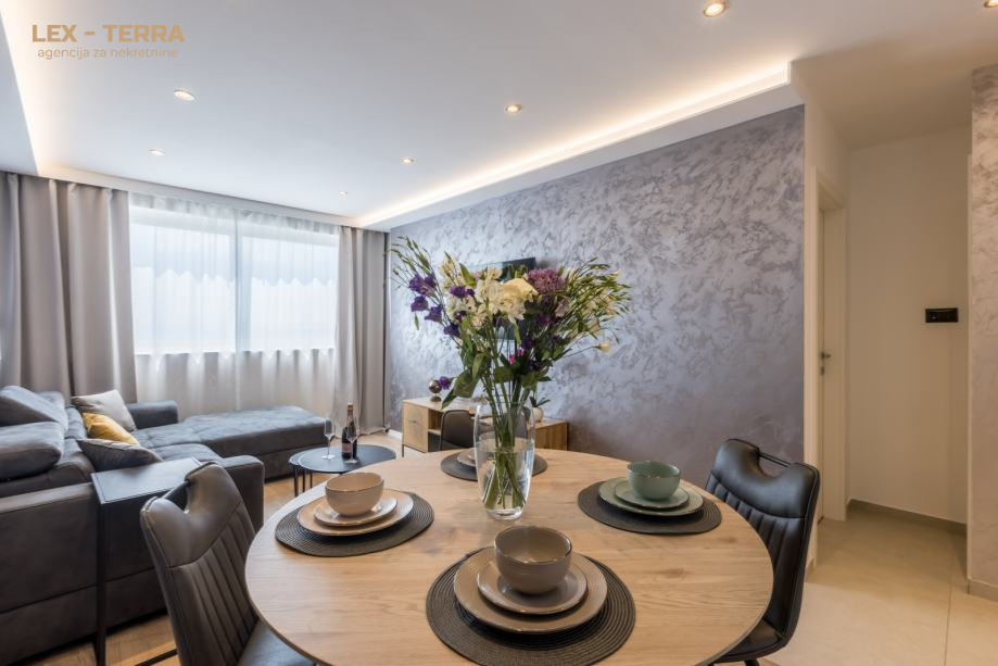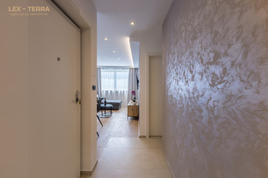 Nalazi se na zadnjem, 5. katu zgrade bez lifta i prvi je do izlaza na veliku zajedničku terasu, što osigurava dodatni prostor za opuštanje i uživanje. Uz stan pripada ostava od 8 m², a parking je zajednički ispred zgrade.