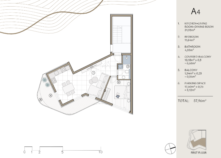 Predstavljamo stan A4 – prostrani jednosoban apartman smješten na katu luksuzne novogradnje VALI 1, u Rogoznici.