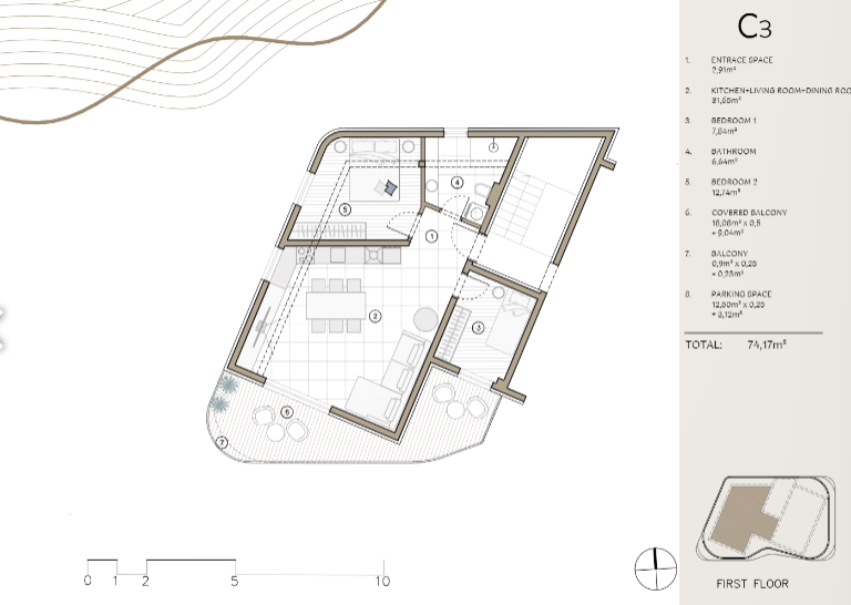 Predstavljamo stan C3, elegantan dvosoban apartman smješten na prvom katu luksuzne novogradnje VALI 3 u Rogoznici.