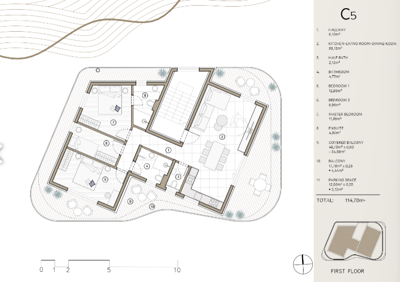 Zgrada kombinira valovitu arhitekturu i luksuzne materijale, a penthouse C5 pruža najviše od svega – pogled, prostor i eleganciju bez kompromisa.