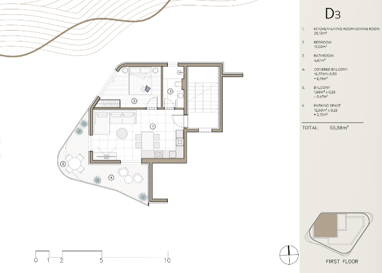 Predstavljamo stan D3, elegantan jednosoban apartman smješten na prvom katu luksuzne novogradnje VALI 4 u Rogoznici.
