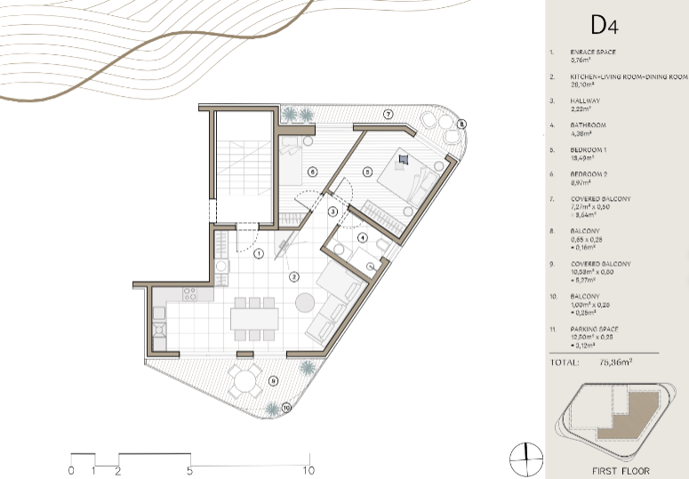 Zgrada kombinira valovitu arhitekturu i luksuzne materijale, što svaki stan čini posebnim i prepoznatljivim.