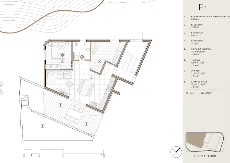 Predstavljamo stan F1, moderan dvosoban apartman smješten u prizemlju luksuzne novogradnje VALI 6 u Rogoznici.