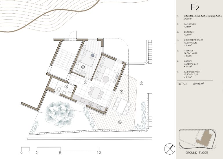 Predstavljamo stan F2, elegantan jednosoban apartman smješten u prizemlju luksuzne novogradnje VALI 6 u Rogoznici.